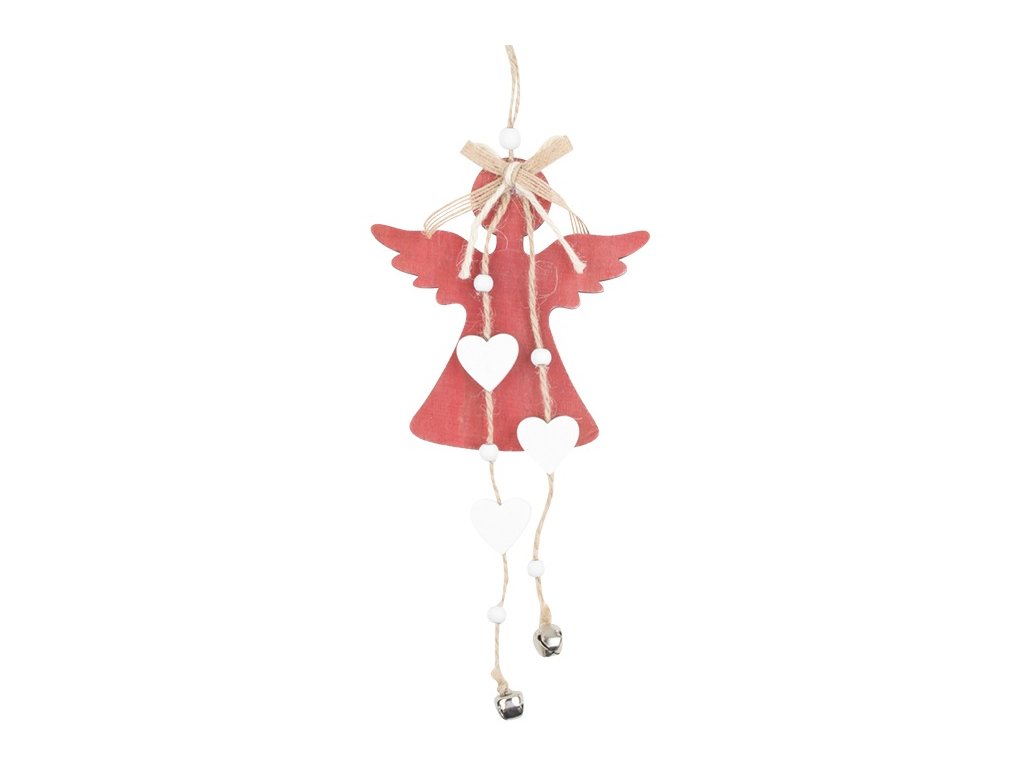 Dekorace na zavěšení Látková mašle Rolničky Dřevěné detaily Vánoční dekorace na zavěšení ve tvaru anděla v červené barvě. Andílka ze dřeva zdobí látková mašlička, dřevěný korálek na šňůrce a dva provázky s dřevěnými srdíčky a korálky, zakončené rolničkou.Doplňkové parametry