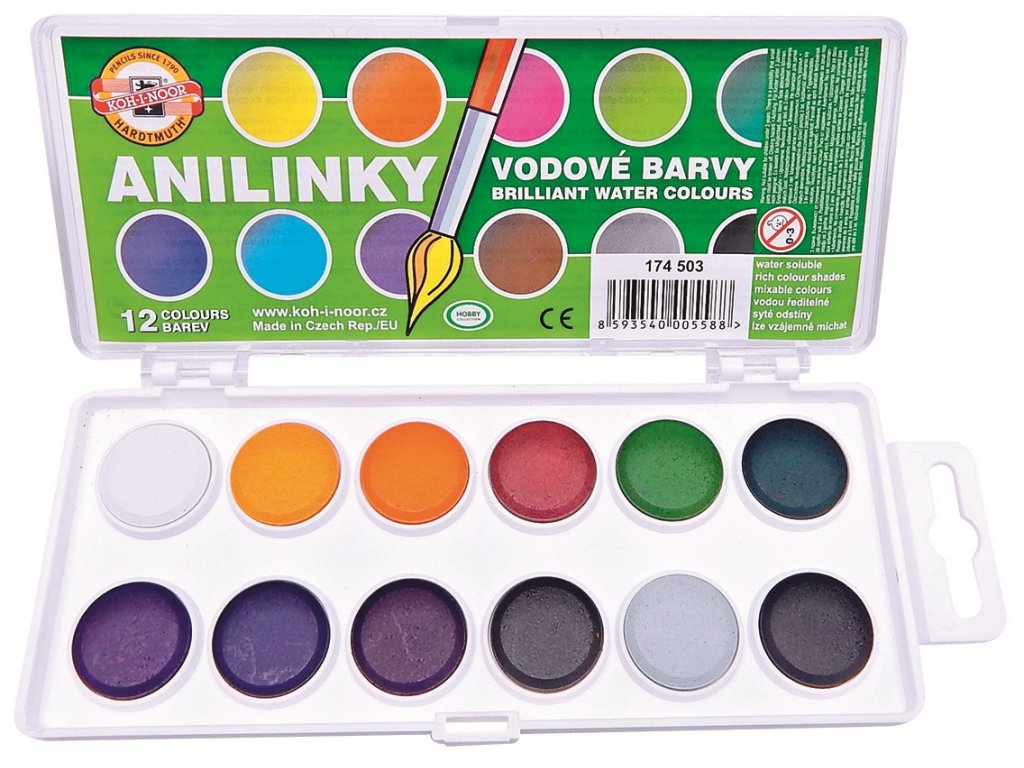 Vodové barvy ANILINKY vynikají pestrými a sytými barvami. Vhodné jsou pro výtvarné návrhy, kolorování, malby portrétů, krajin, velmi žádané jsou při malování kraslic. Velikost tablet je 22,5mm v průměru.