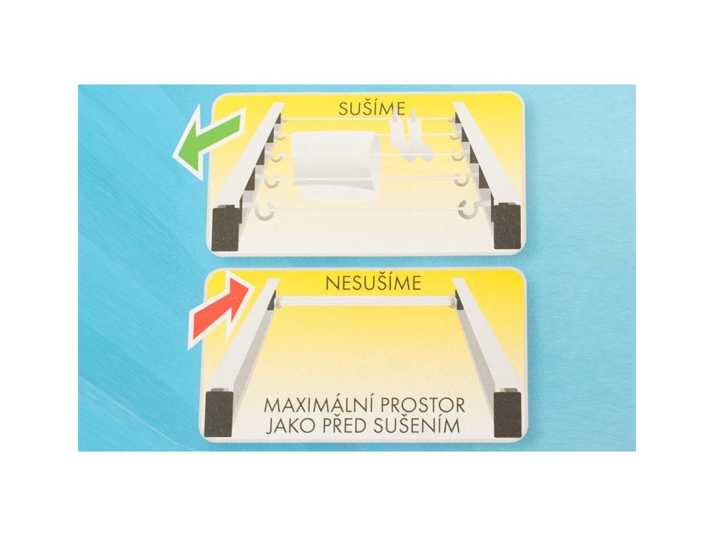 Kvalitní pevná hliníková konstrukce s posuvnými háčky. V případě, že prádlo nemáte pověšené, shrnete šňůry na stranu.