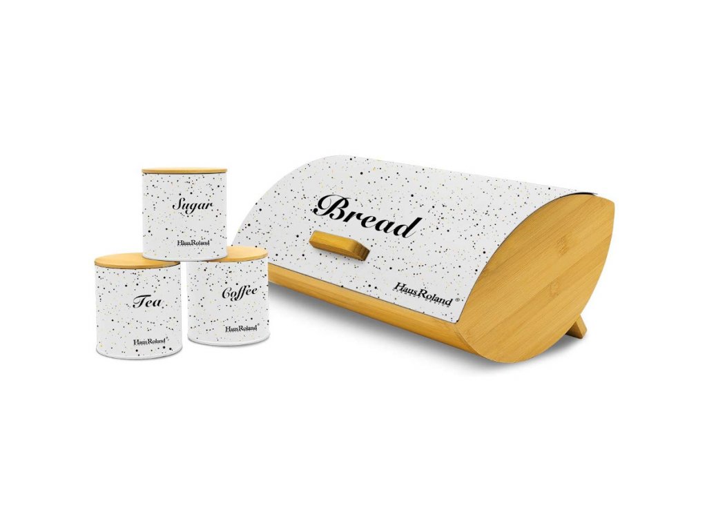 Elegantní chlebník s netradičním designem v sadě s dózami na kávu, čaj a cukr.