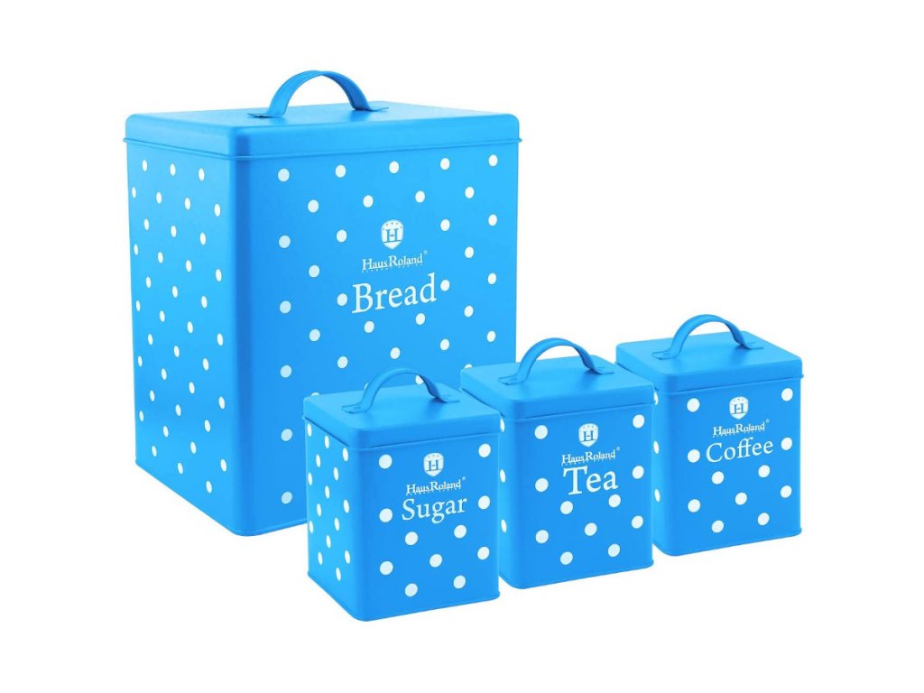 Praktický kovový chlebník pro uskladnění pečiva v domácnosti. Součásti chlebníku jsou i 3 dózy ve stejném designu pro uskladnění kávy, čaje a cukru.