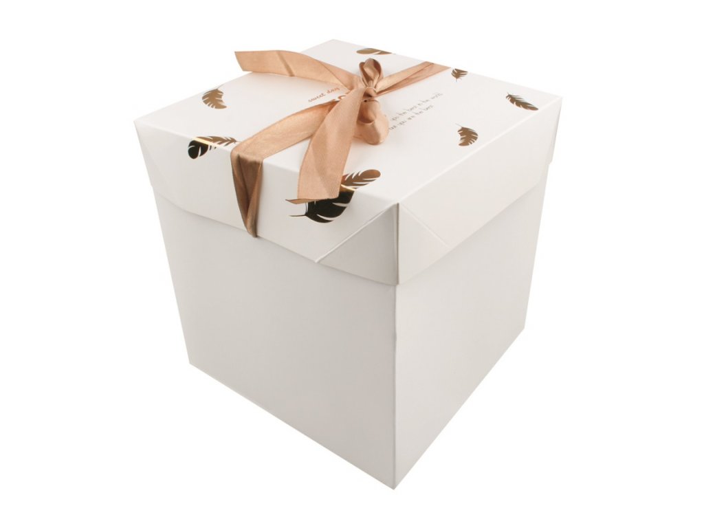 Skládací dárková krabička s mašlí a zlatými peříčky. Nabízené velikosti krabiček: M - 16,5 x 16,5 x 16,5 cm L - 21,5 x 21,5 x 21,5 cmDoplňkové parametry