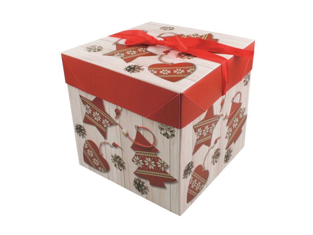 Vánoční skládací dárková krabička s mašlí a obrázkem perníčků. Nabízené velikosti krabiček: M - 16,5 x 16,5 x 16,5 cm L - 21,5 x 21,5 x 21,5 cmDoplňkové parametry