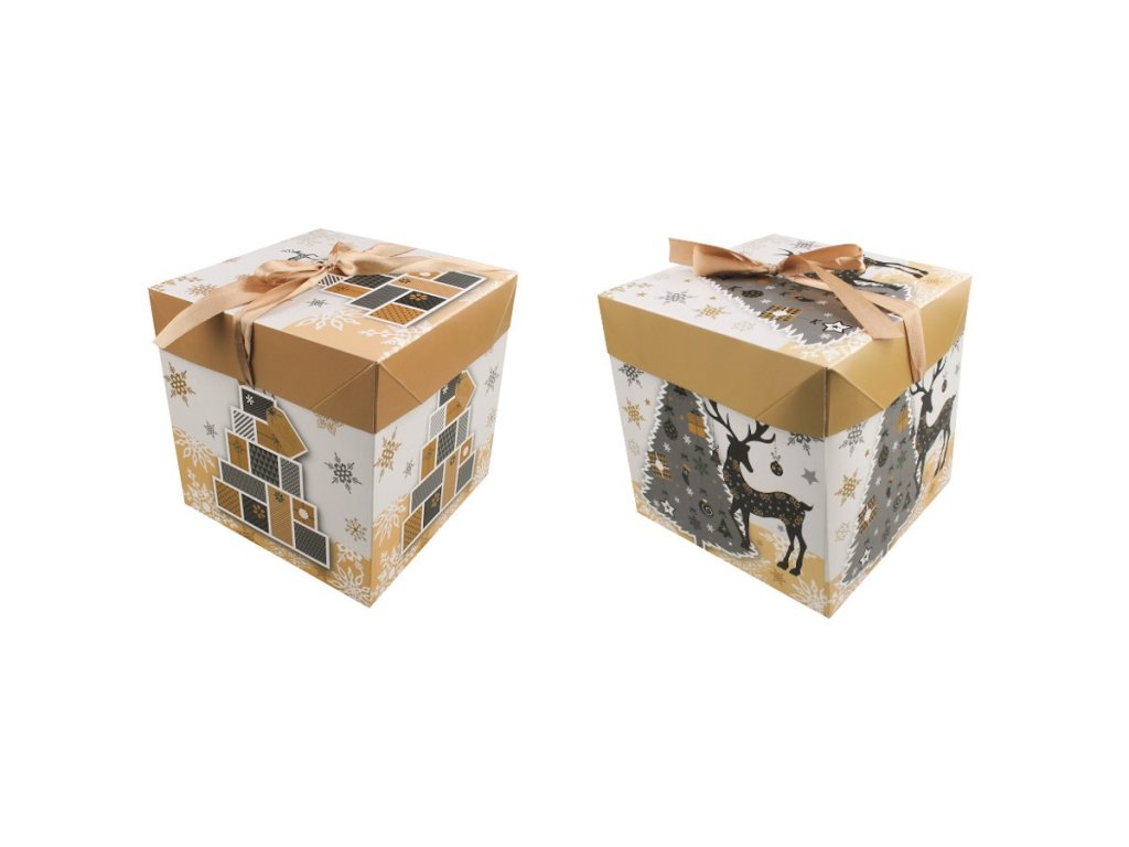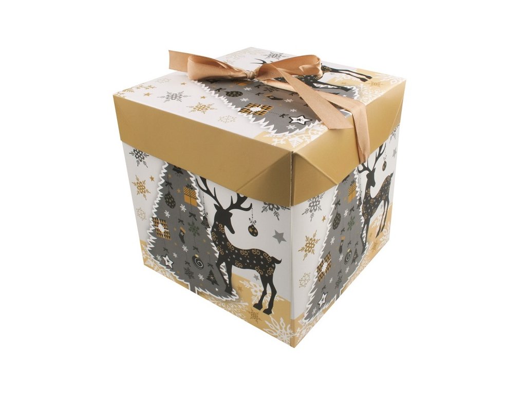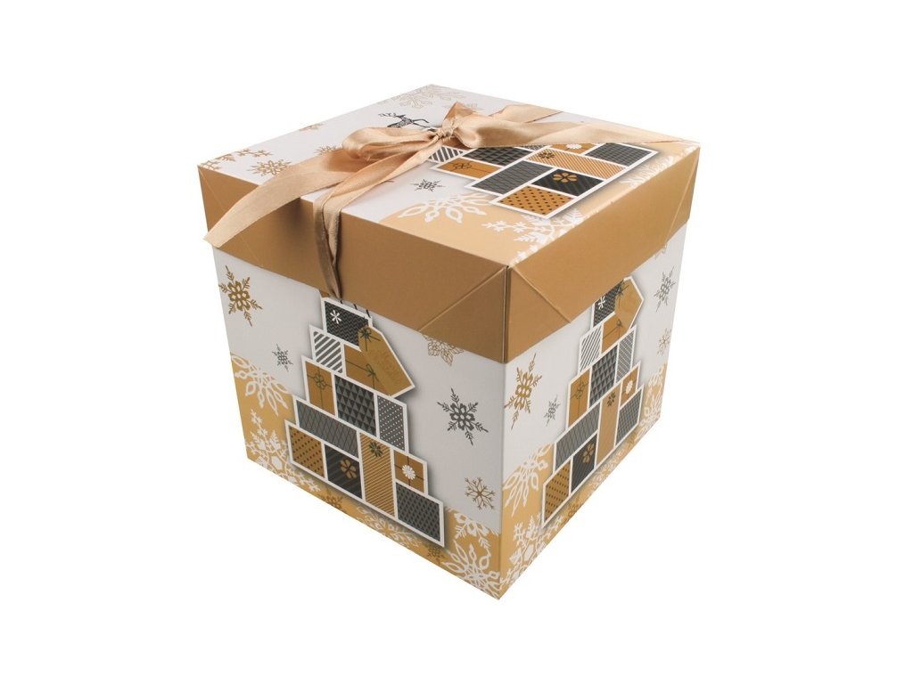 Skládací dárková krabička s mašlí ve zlatém provedení ve velikosti M. Rozměr krabičky: 16,5 x 16,5 x 16,5 cm Nabízené motivy krabiček: dárky, stromek s jelenemDoplňkové parametry