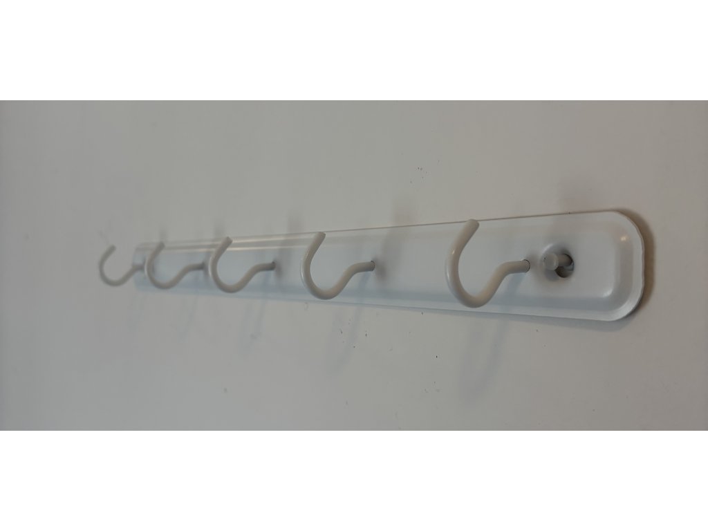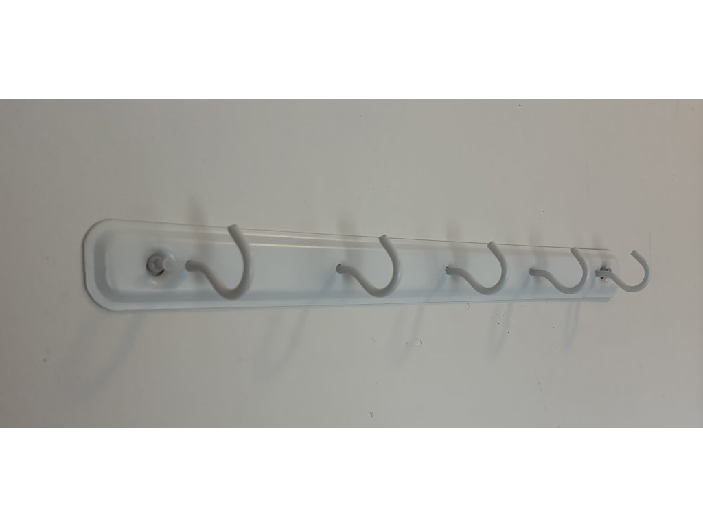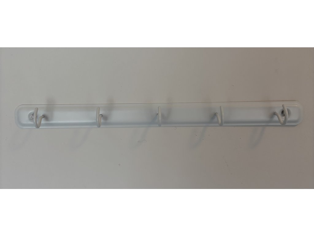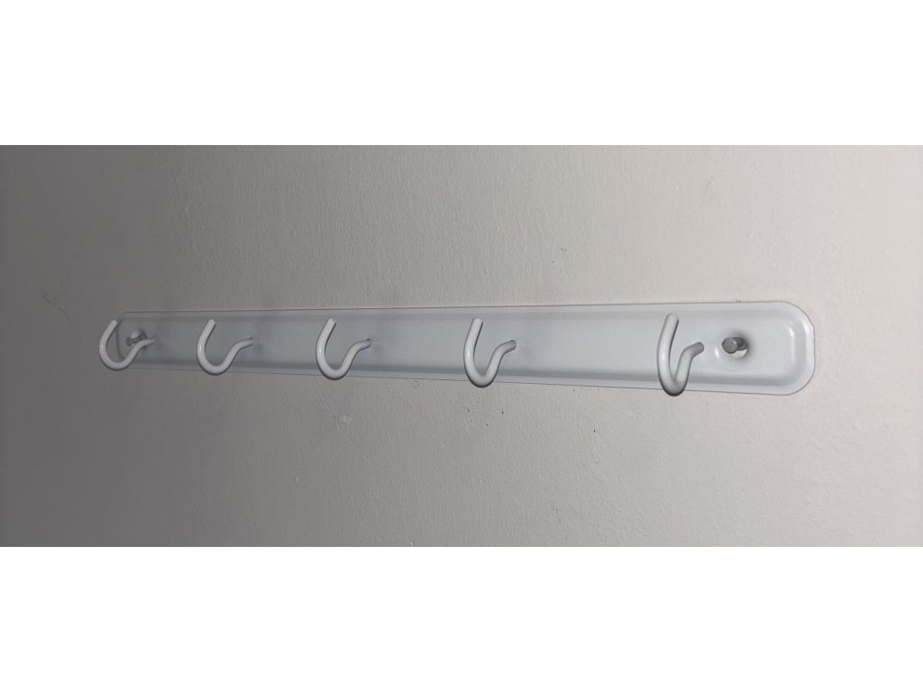 Praktický bílý držák prádelních šňůr s 5 háčky o délce 50 cm. Ideální řešení pro balkony, lodžie nebo koupelny. Konstrukce z odolné oceli umožňuje dlouhodobé používání bez deformace.