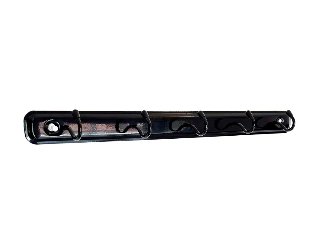 Černý držák šňůr o délce 60 cm, 6 háčků. Stabilní kovová konstrukce vhodná pro každodenní sušení.