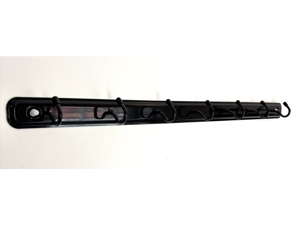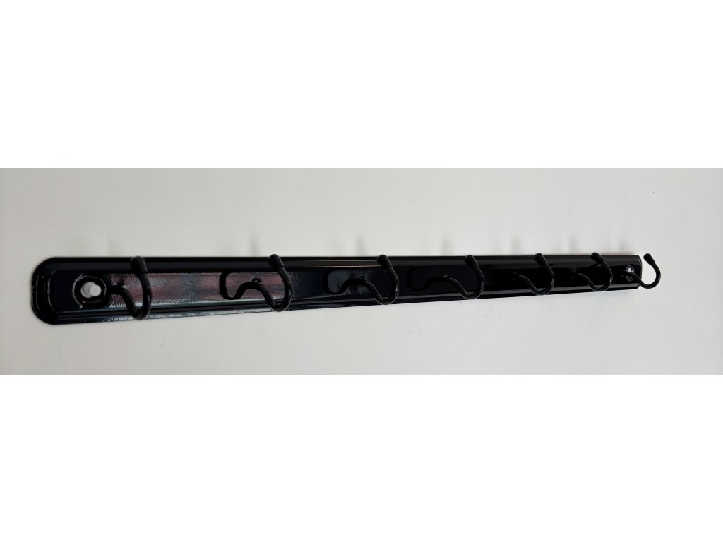 Držák prádelních šňůr v černé barvě o délce 70 cm, osazený 7 háčky. Vyroben z pevné oceli pro vysokou stabilitu a spolehlivost i při častém zatížení. Určený pro balkony, lodžie i vnitřní prostory.