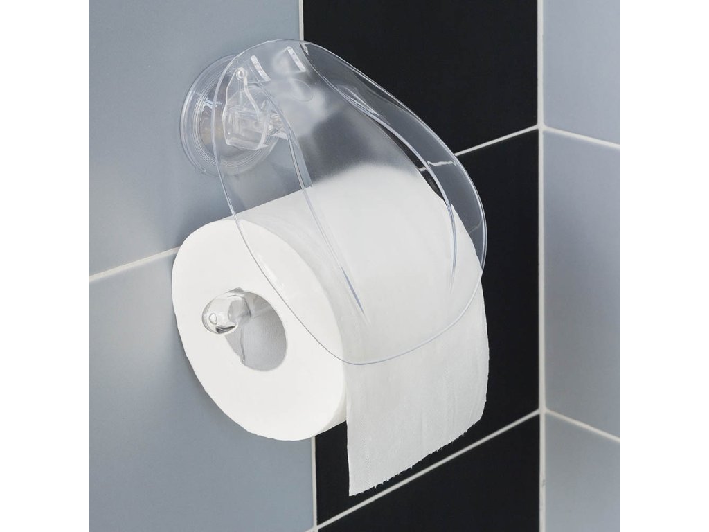 Plastový držák toaletního papíru s klapkou. Držák je na stěnu připevněn pomocí vakuové přísavky.