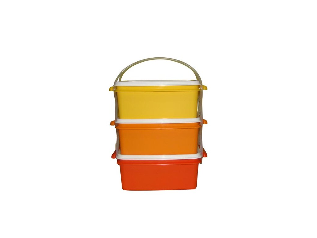 Jídlonosič s hranatými miskami. Jídlonosič má 3 hranaté díly o objemu 1,2 l. Díly jsou navzájem propojené držadlem.