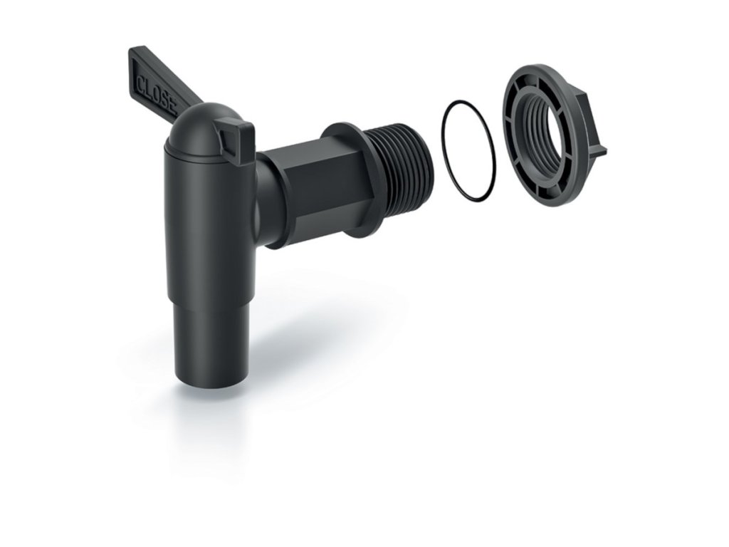 Plastový kohoutek se šroubením vhodný pro připojení k nádobě na dešťovou vodu Amfora, Woodcan, Wallycan, Canyon, Raincan, Aqua Tower, Tower stone ...