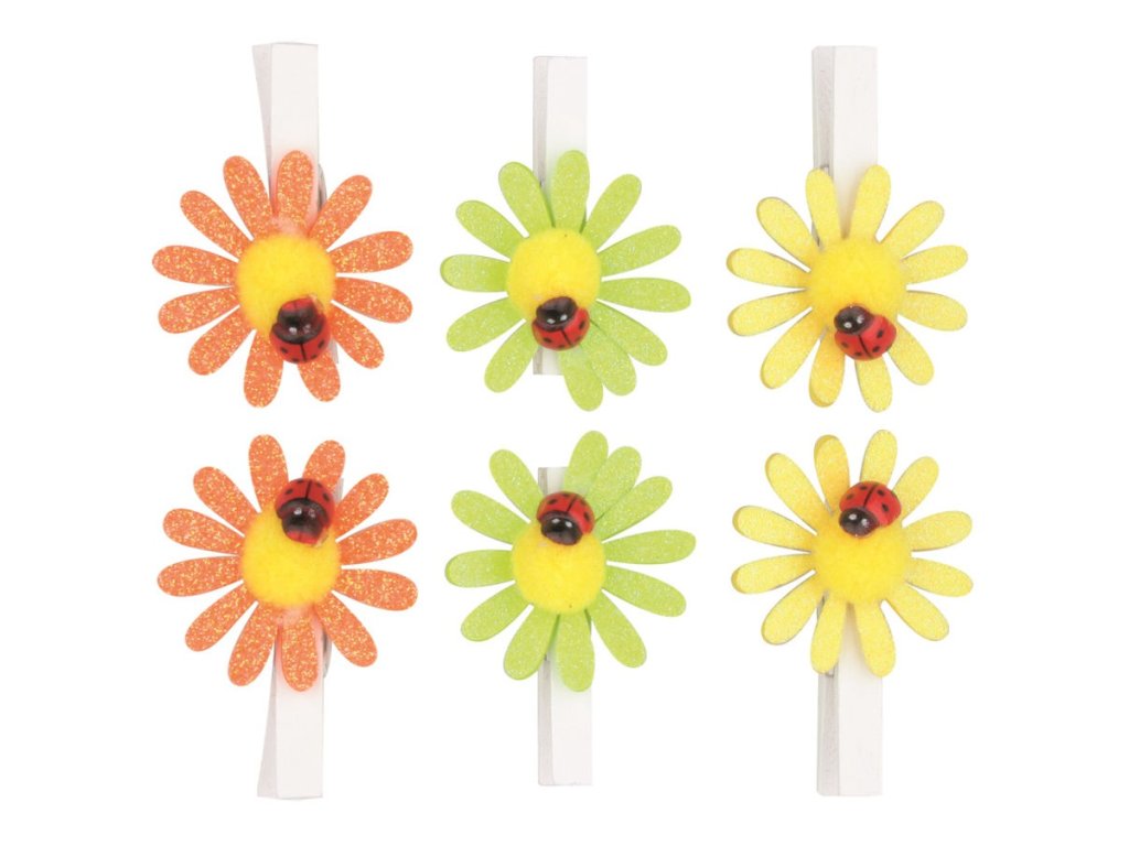 Kytičky s glitry a beruškou na kolíčku 5 cm, 6 ks v sáčku