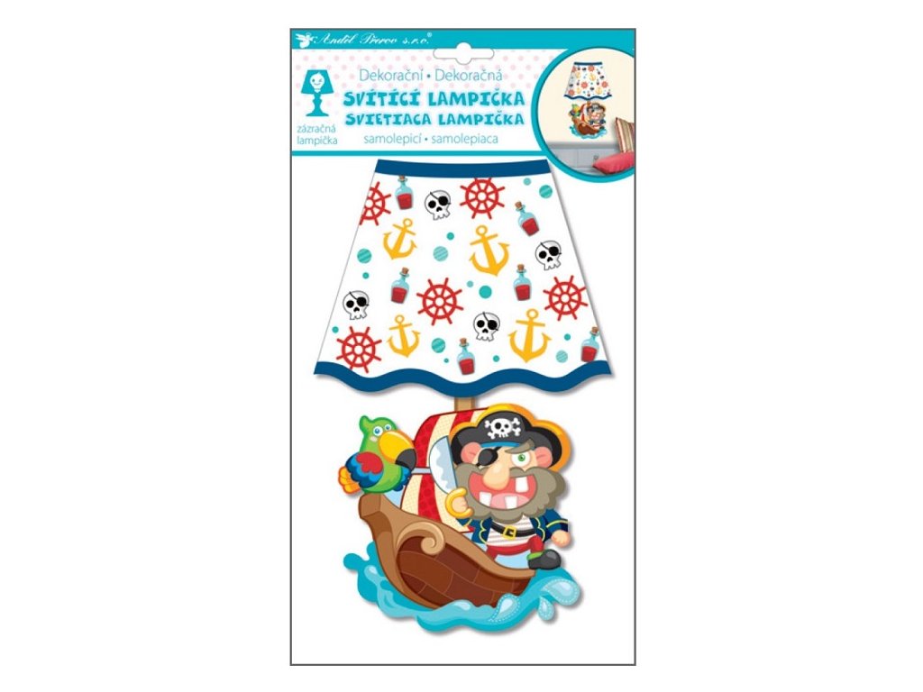 Lampička samolepicí svítící LED piráti 27cm Vhodná na stěny a jiné hladké plochy. Návod: 1. Před nalepením sundejte krycí fólii a odstraňte pojistku 2. Přilepte na suché a rovné místo 3. Při doteku se lampička rozsvítí a po chvíli sama zhasne. 4. Životnost baterií je cca 600 hodinDoplňkové parametry