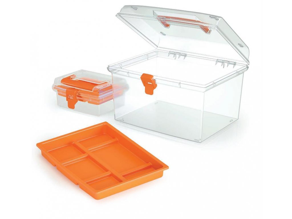 Box je celoprůhledný se zaklapovacím zámkem a uchem na přenášení.
