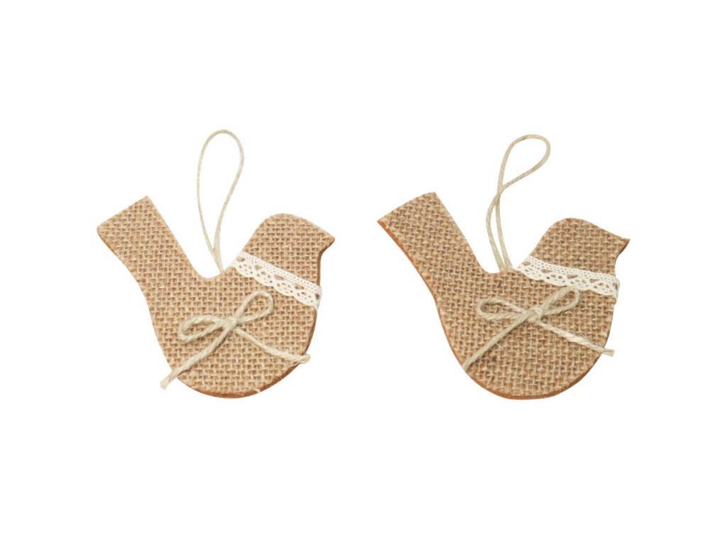 Ptáček jutový s krajkou 8 cm na pověšení 2 ks