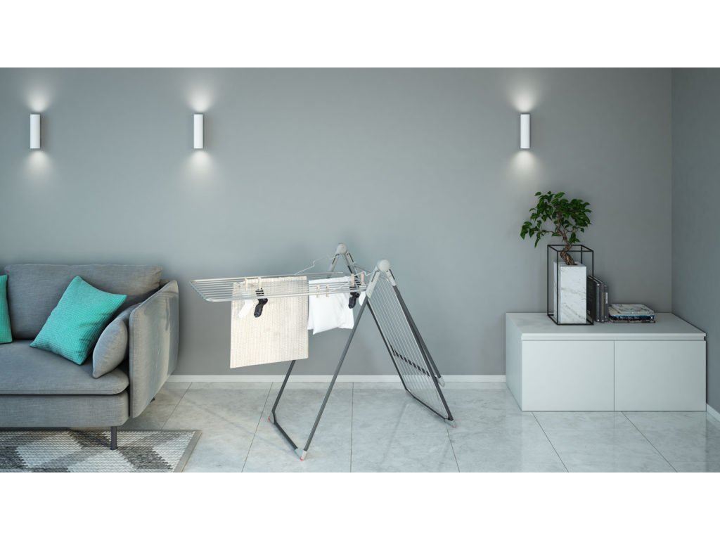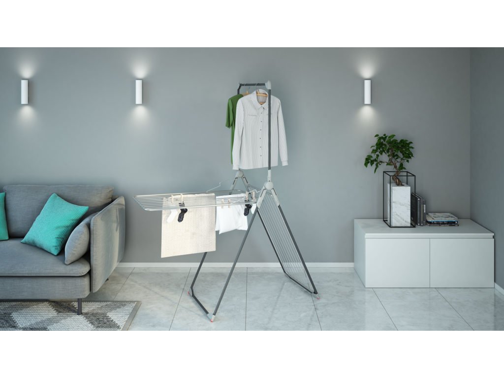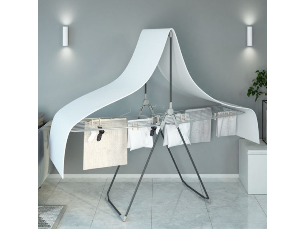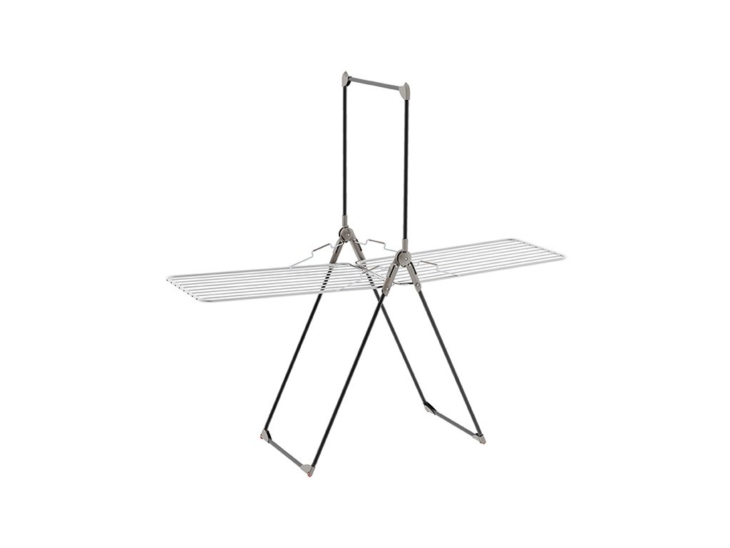 Variabilní sušák na prádlo s dvěma křídly a stojanem pro zavěšení oblečení na ramínkách. Stojan také využijete pro zavěšení dlouhého prádla jako ručníků, povlečení nebo prostěradel. Stabilní nohy sušáku zabrání jeho převrácení.
