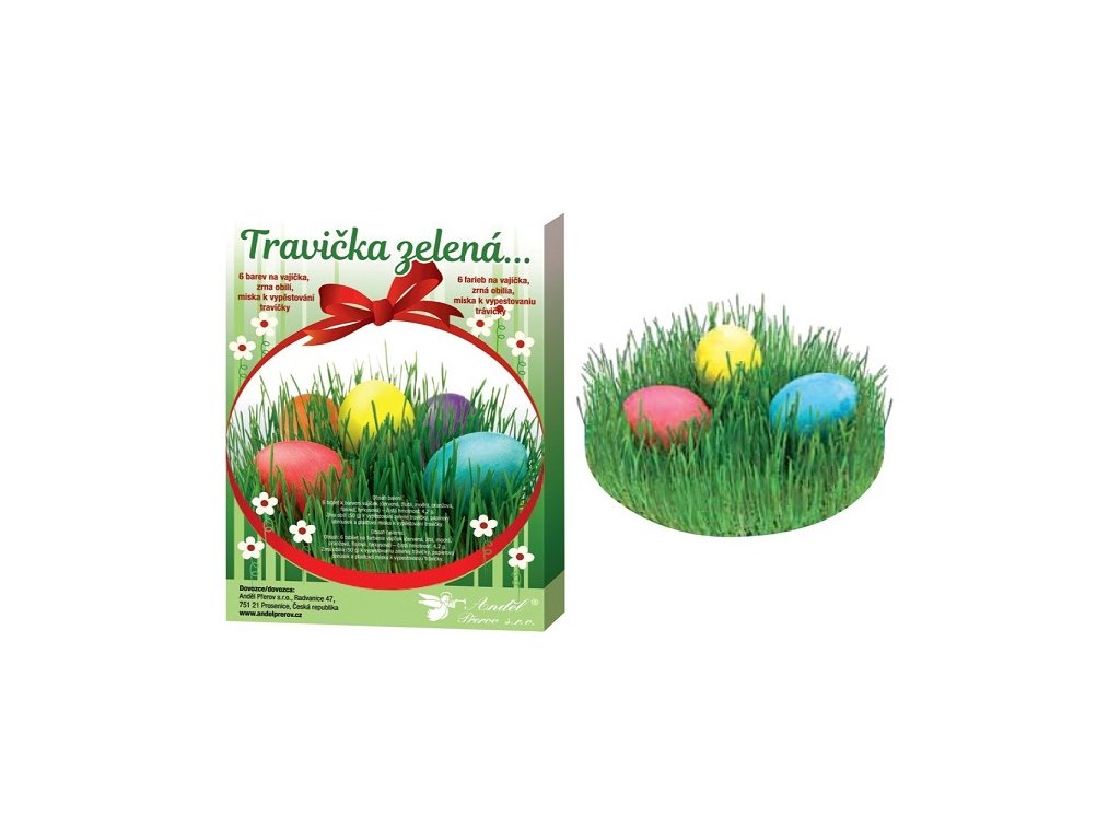 6 tablet k barvení vajíček 4,2 g (červená, žlutá, modrá, oranžová, fialová, tyrkysová), zrna obilí (50 g) k vypěstování zelené travičky, papírový ubrousek a plastová miska k vypěstování travičky.