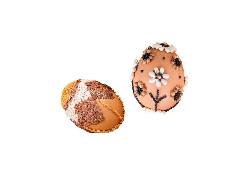 3. Štětcem rozetřete lepidlo po předkresleném ornamentu. Párátkem nabírejte semínka a přilepujte na skořápku. Vyloupnutím perforace na zadní straně krabičky získáte sušák na vajíčka. V něm nechejte vajíčko uschnout.