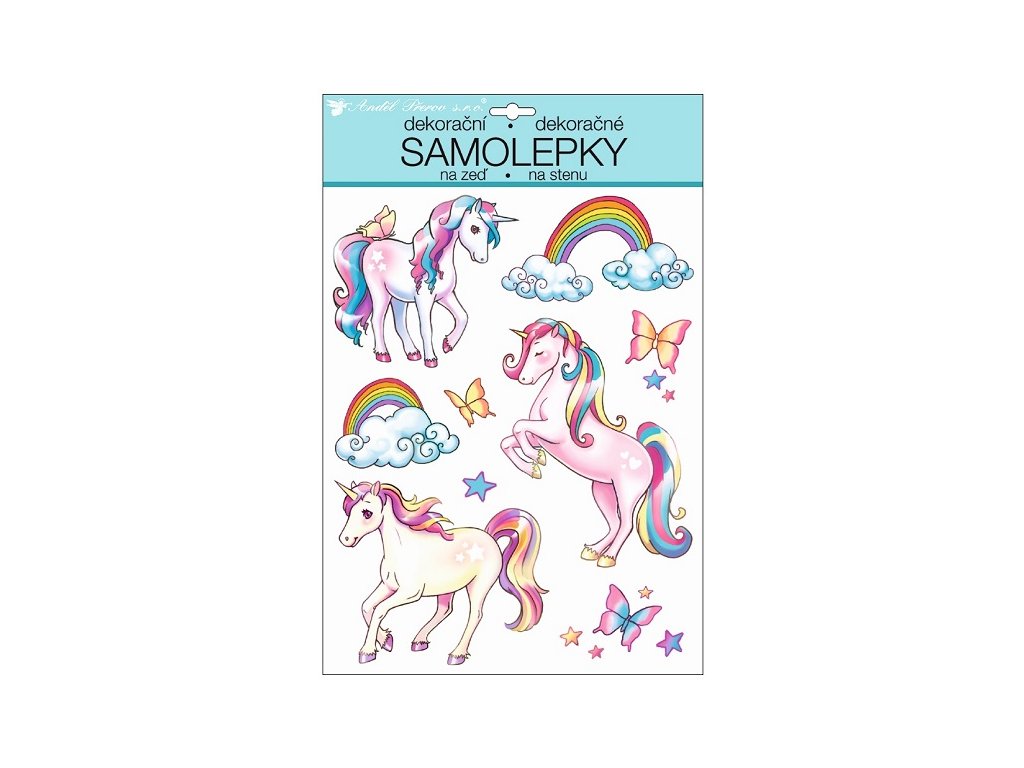 Samolepky na zeď jednorožci a motýli s glitry. Rozměr: 35 x 27 cm NÁVOD K POUŽITÍ SAMOLEPKY: Opatrně samolepku sejměte z podkladového papíru. Umístěte na zvolenou čistou a suchou plochu. Vyhlaďte od středu ke krajům.Doplňkové parametry