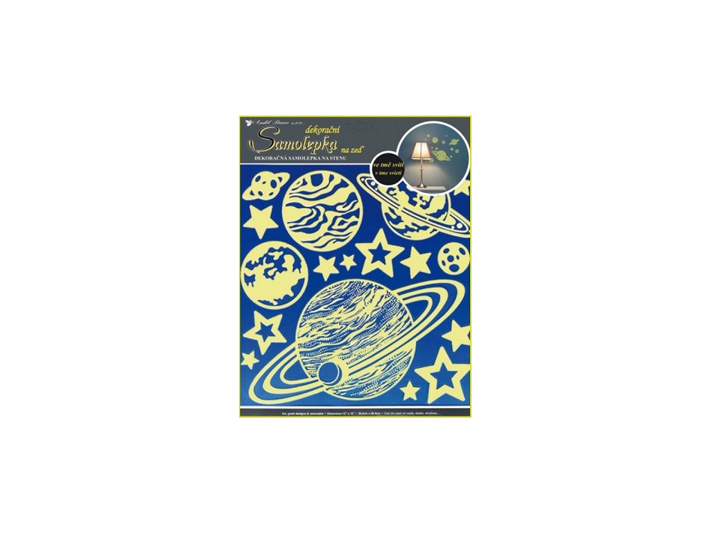 Samolepky na zeď planety svítící ve tmě 31x29cm. Snadné použití! Vhodné na stěny, okna, zrcadla, kachličky a jiné hladké plochy! NÁVOD: Opatrně sejměte samolepku z podkladového papíru a umístěte ji na zvolenou suchou a čistou plochu. Vyhlaďte od středu ke krajům.Doplňkové parametry