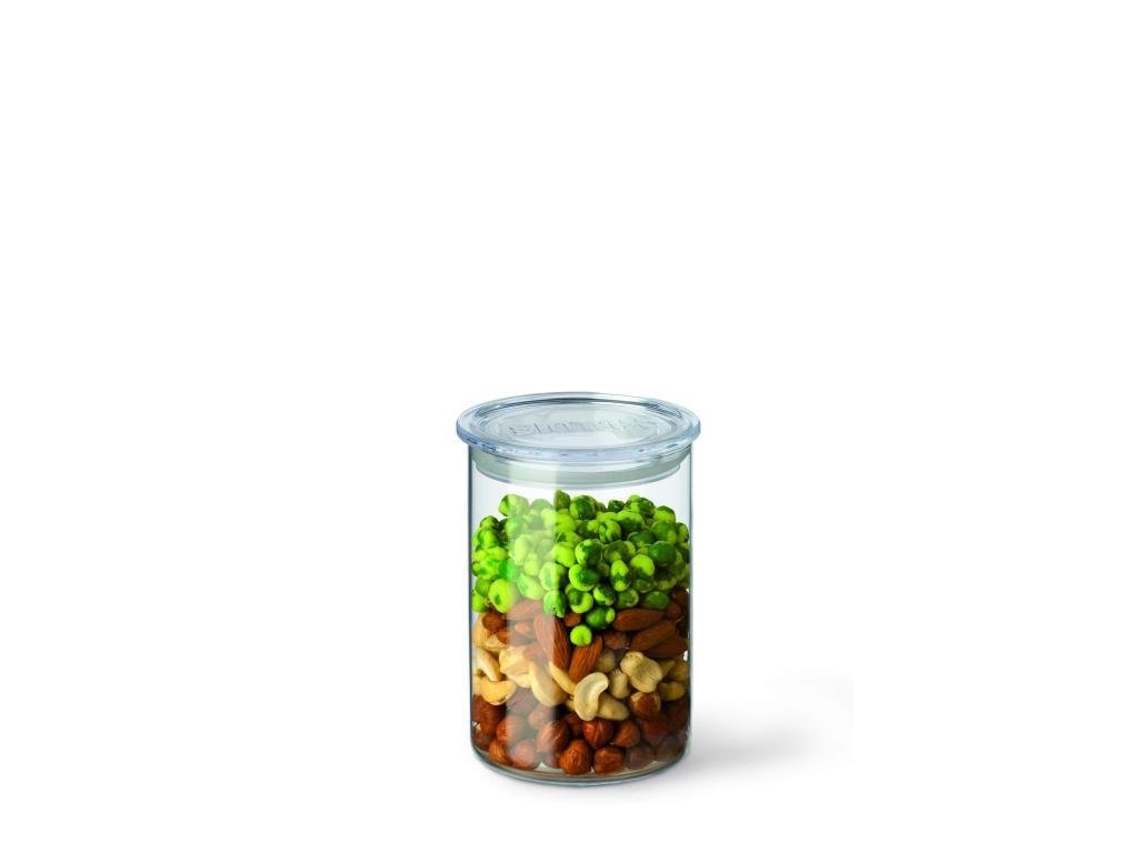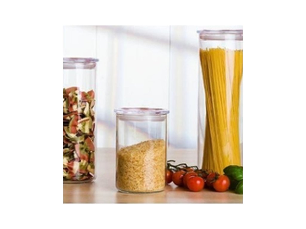 Skleněná dóza na suché potraviny s vakuovým víkem z tvrzeného plastu.