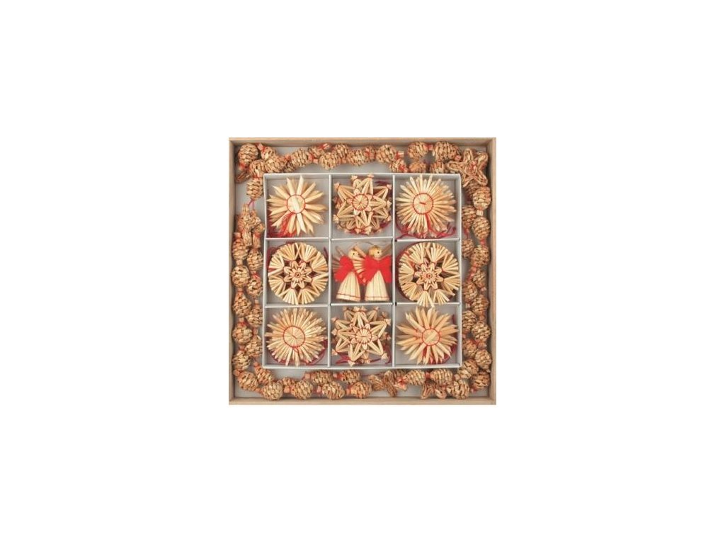 Slaměné dekorace v dřevěné krabičce 51 ks s řetězem 2 m