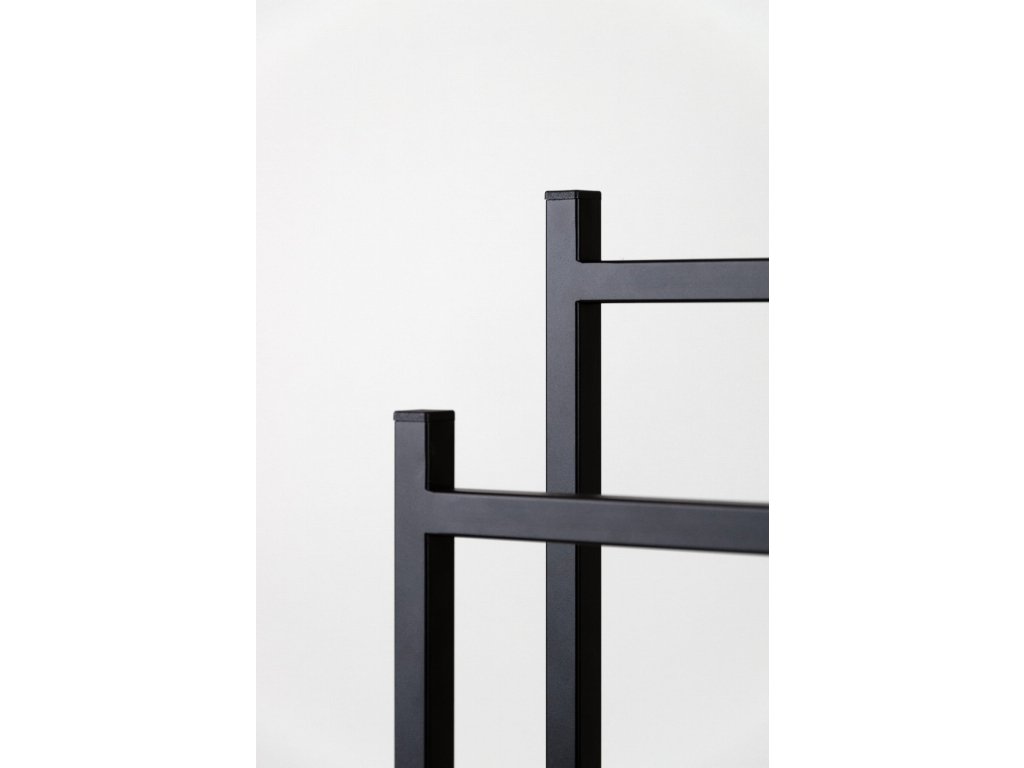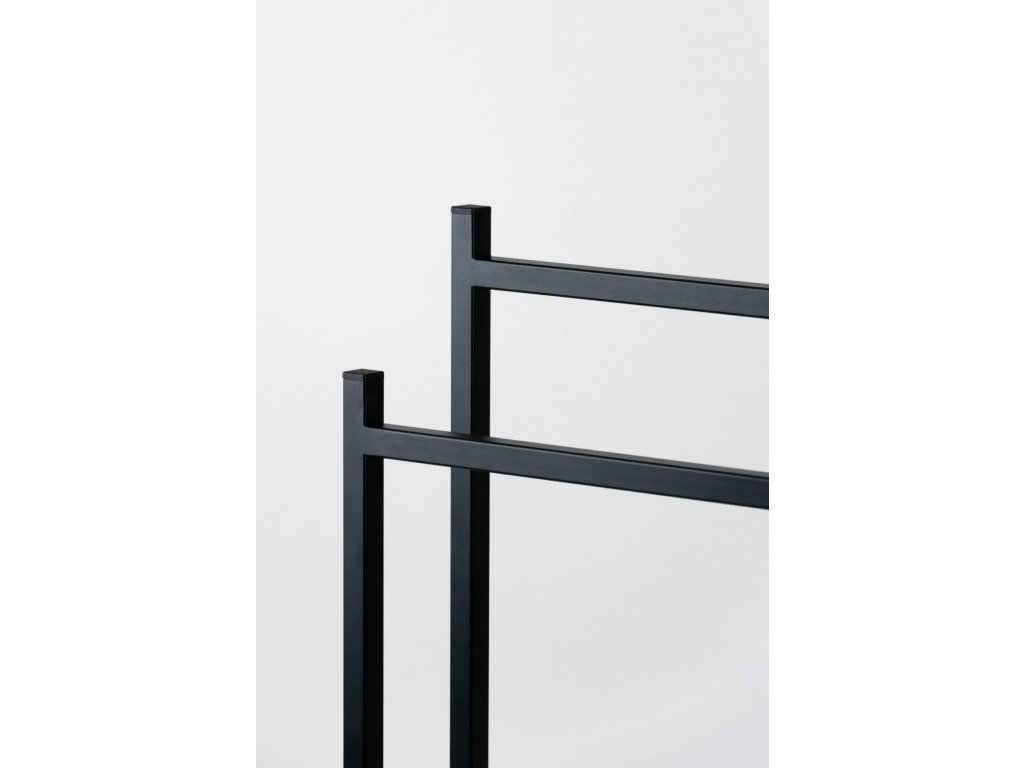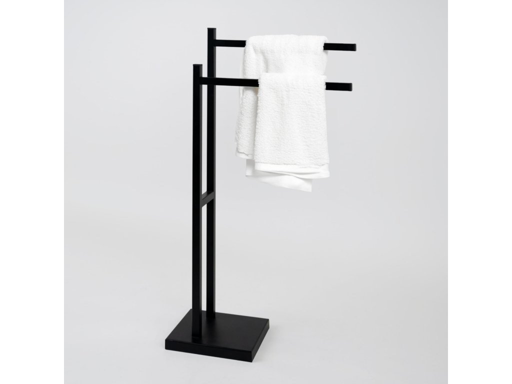 Stojan má stabilní základnu o rozměrech 18 × 22 cm, která zajišťuje rovnováhu a bezpečnost i při zavěšených ručnících. Moderní a minimalistický design se hodí do různých koupelnových i domácích interiérů a přináší praktickou eleganci.