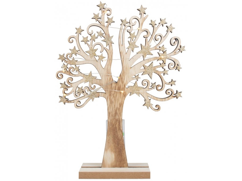 Strom dřevěný se zlatými hvězdami 22 x 30 cm, s LED světýlky