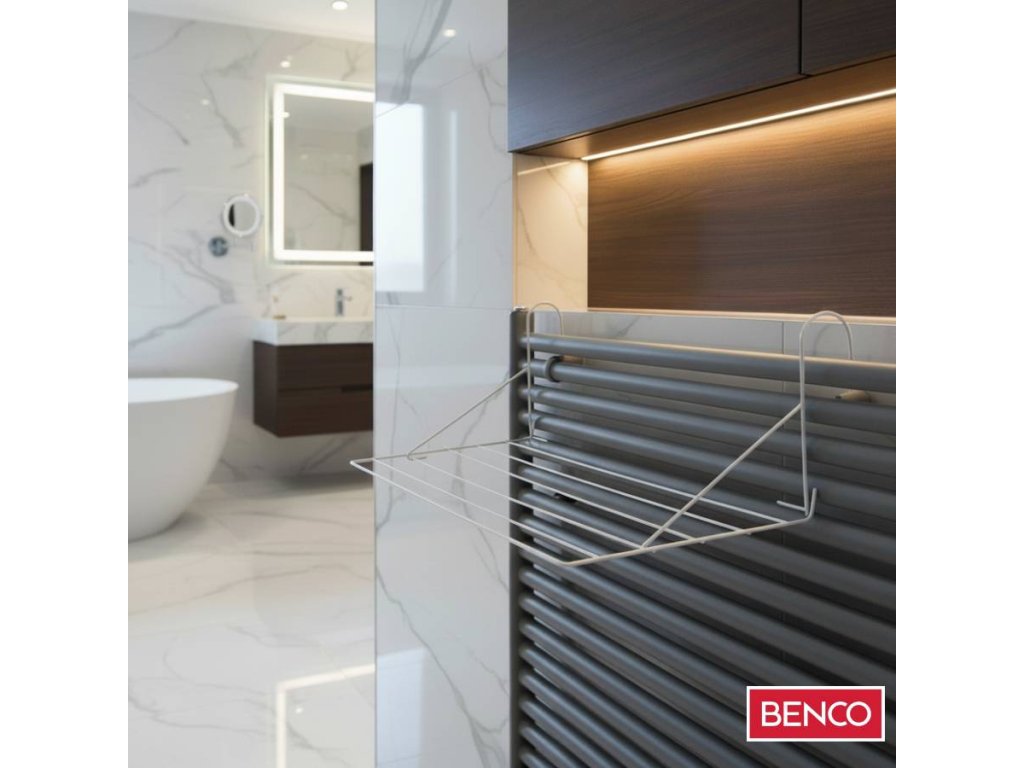 Sušák lze zavěsit na radiátor, vanu, sprchový kout, i na balkon, zábradlí,...