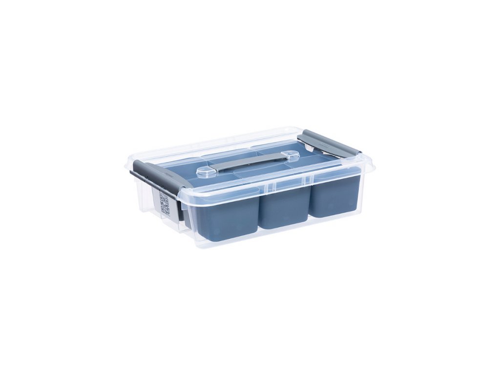 Průhledný plastový úložný box s víkem obsahuje 6 vyjímatelných přihrádek.