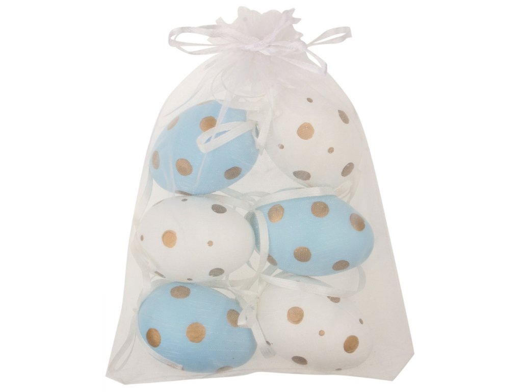 Vajíčka se zlatými puntíky plastová na zavěšení 6 cm, 6 ks v organze