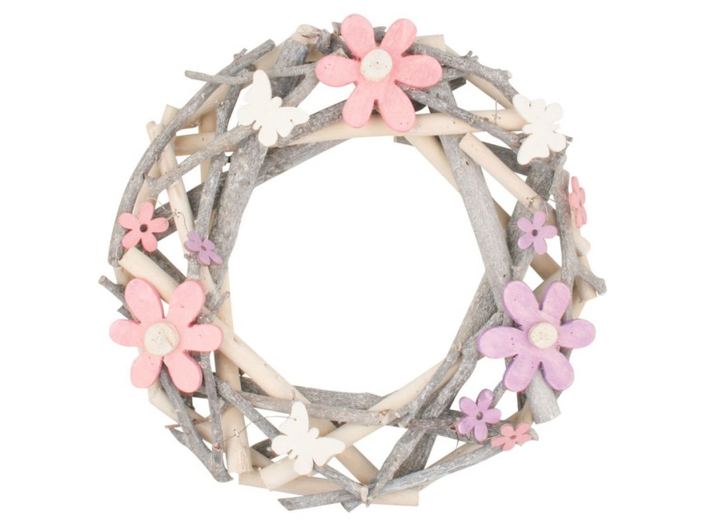 Veněc z větviček s barevnými kytičkami a motýlky 30 cm
