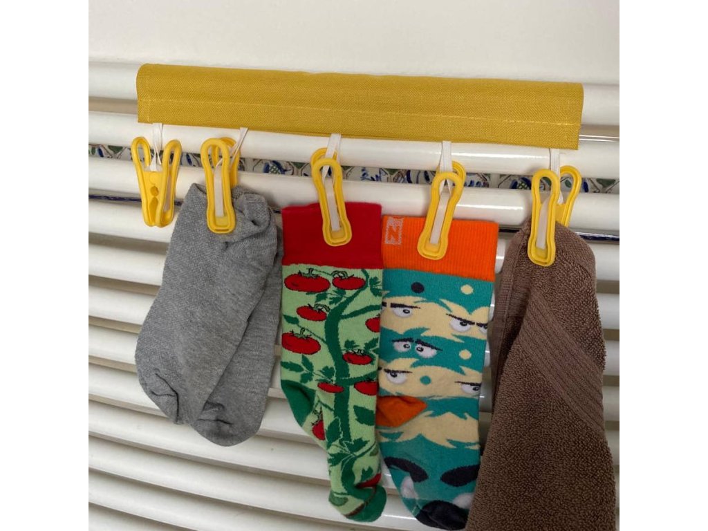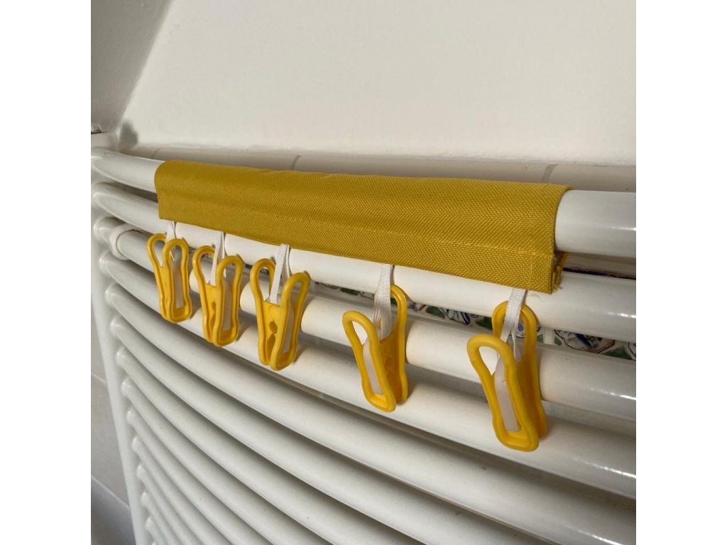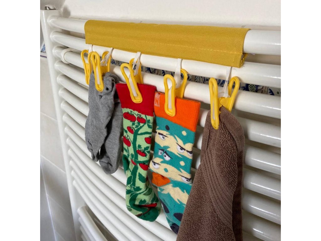 Věšák na ručníky a drobné prádlo připvníte pomocí suchého zipu na žebřinový radiátor.