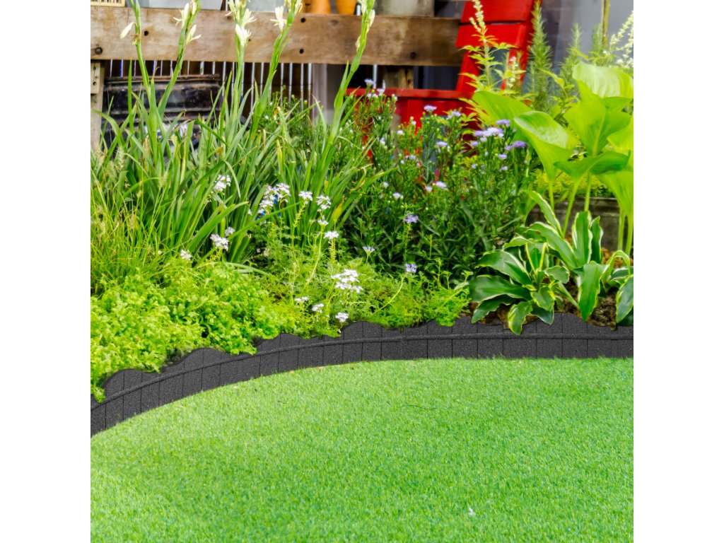 Zahradní obrubník z gumy slouží k ohraničení trávníku od záhonu.