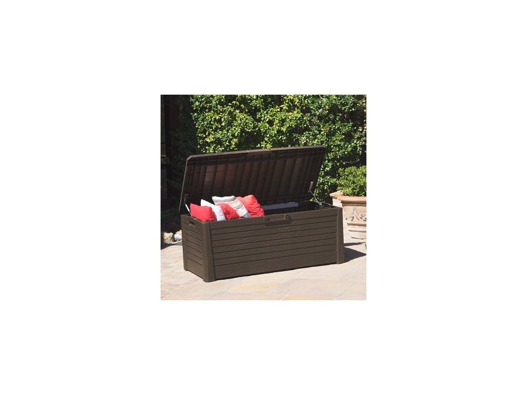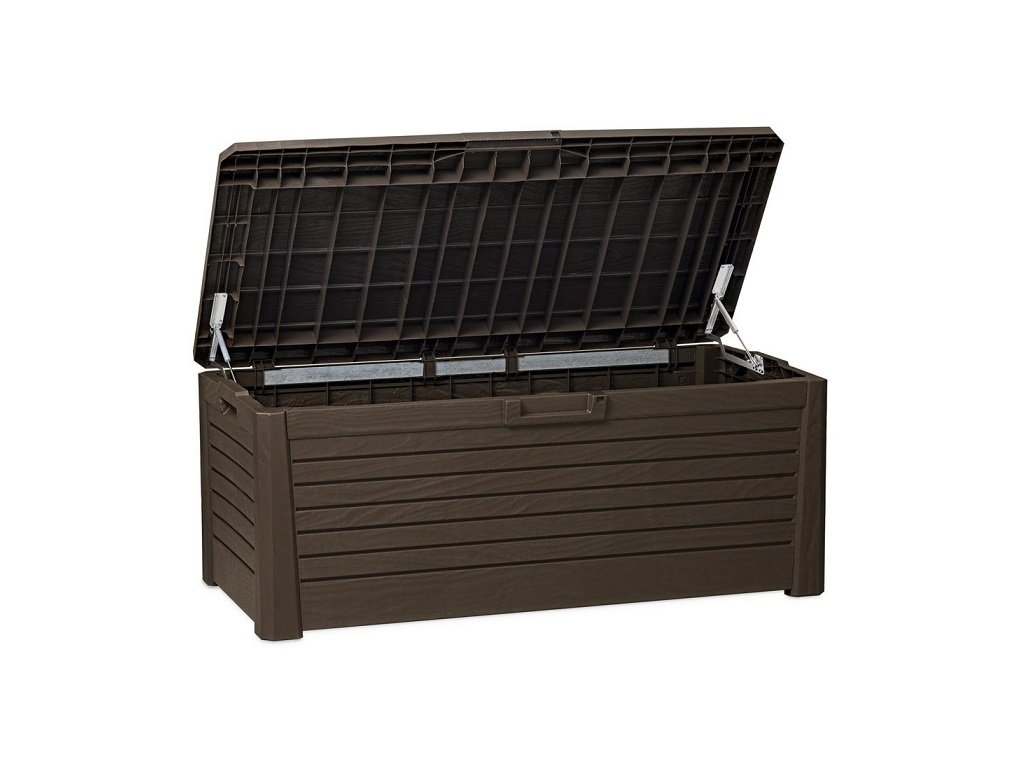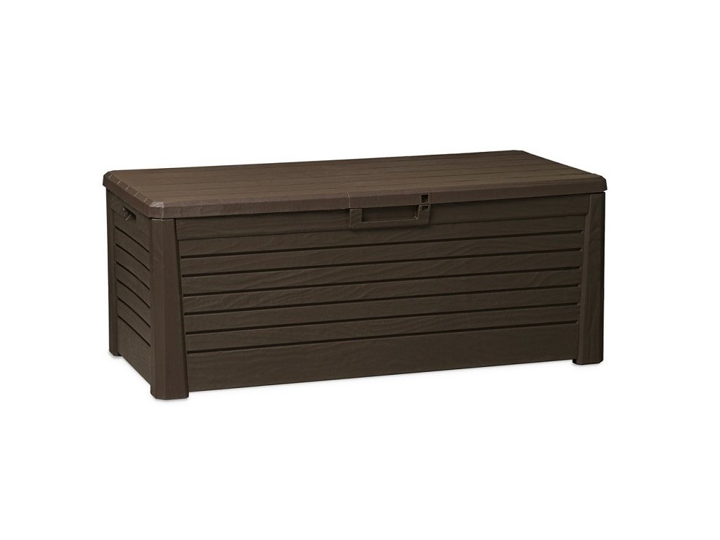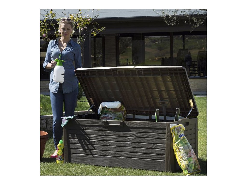 Pevný a objemný 550 litrový plastový úložný box zaujme dřevěným dekorem. Box umožní sezení 2 osob.